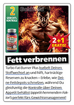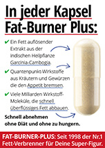Die neuen Turbo Fat-Burner-Plus Kapseln (mit 40% mehr Wirkung) wirken jetzt 2-fach. Einmal dank dem fettauflösenden Extrakt aus der indischen Heilpflanze Garcinia-Cambogia. Und zum zweiten mit den weltweit einzigartigen Quantenpunkt-Wirkstoffen, die zusätzlich Deinen Appetit bremsen. Diese Kombination aus Fett-Verbrennung und natürlich gebremster Kalorien-Aufnahme hat schon seit 1998 hunderttausenden Anwendern(innen) zum gewünschten Figur-Erfolg verholfen.