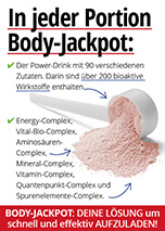 Mit Body Jackpot gibst Du Deinem Körper alles was er braucht. Nur ein Drink alle ein oder zwei Tage, das reicht! Sofort nach der ersten Einnahme werden tausende wichtige Körper-Funktionen auf Touren gebracht. So viel Power gab es bisher noch nie in einem einzigen Drink. Du wirst es sofort spüren!