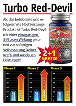 Die einzigartige 3 Phasen-Wirkung macht Turbo Red-Devil so vorteilhaft. Deine Muskeln werden wie durch einen Doppel-Turbo aufgeladen. Spätestens 20-30 Minuten nach der Einnahme spürst Du die Wirkung. Jetzt geht in jedem Training und Wettkampf richtig die Post ab. (siehe Tabelle)