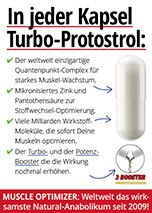 Die Wirkung von Turbo-Protostrol stellt die Sport-Welt auf den Kopf! Turbo-Protostrol enthält Bio-Zell-Wirkstoffe, die sofort in Deine Muskel-Zellen gelangen. Dort verbessern sie 24 Stunden lang Dein Muskel-Wachstum. Turbo-Protostrol schützt Dich auch ganz besonders effektiv vor unerwünschtem Muskel-Abbau und verhindert so Leistungs-Verlust.