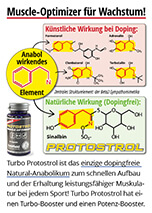 Turbo-Protostrol hat einen ähnlichen Effekt auf ein stärkeres und besseres Muskel-Wachstum wie künstliche Anabolika (künstliche Anabolika sind Steroid-Hormone, die ein schnelles Muskel-Wachstum fördern. Wegen der gesundheitlichen Risiken zählen sie zu den verbotenen Doping-Substanzen). Alle Wirkstoffe von Turbo-Protostrol werden kontrolliert und sind 100% dopingfrei. Du spürst schon nach wenigen Wochen, wie die Muskeln unter Deiner Haut dicker und kräftiger werden!