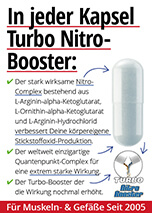 Dein Blut-Kreislauf muss ständig Sauerstoff, Energie- und Aufbau-Stoffe in jede Deiner Körper-Zellen transportieren. Das funktioniert nur dann, wenn sich Deine Blutgefäße erweitern bzw. ausdehnen. Dieser Effekt des Ausdehnens der Blutgefäße wird vom körpereigenen im Blut gelösten Stickstoffoxid (NO) erzeugt. Je mehr Stickstoffoxid (NO) in Deinem Blut vorhanden ist, umso stärker werden Deine Muskel- und Körper-Zellen mit allen wichtigen Nähr- und Aufbau-Stoffen versorgt. Untersuchungen haben ergeben, dass der Turbo-Nitro-Booster Deine natürliche Stickstoffoxid-Produktion um bis zu 300% erhöhen kann. Jetzt verbessern sich Deine Leistungsfähigkeit und Potenz spürbar. Tausende Anwender sind begeistert!