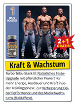 Die Turbo Tribu-Stack III Formel bringt Deine körpereigene Testosteron-Produktion richtig auf Trab. Dadurch verbessert sich Dein Muskel-Wachstum deutlich. Dopingfrei!