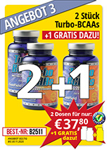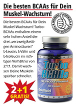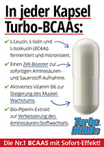 Turbo-BCAAs sind ein Nahrungsergänzungsmittel mit einem sehr hohen Anteil der drei "verzweigtkettigen Aminosäuren" L-Leucin, L-Valin und L-Isoleucin im optimalen Verhältnis von 2:1:1. Deine Muskulatur besteht zu 35% aus BCAAs. Mit Turbo-BCAAs wachsen Deine Muskeln spürbar schneller. (BCAA heißt: Branched Chain Amino Acid)